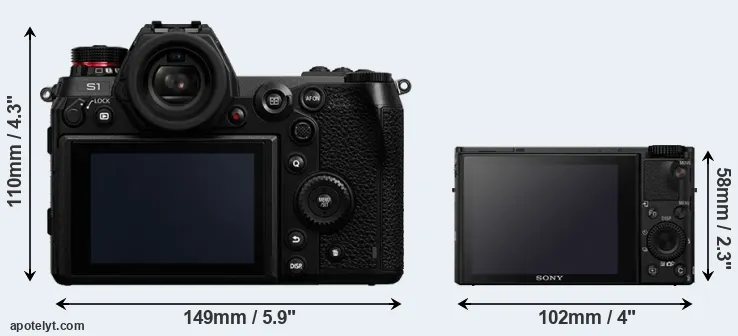 The physical size and weight of the Panasonic S1 and the Sony RX100 IV are illustrated in the side-by-side display below. The two cameras are presented according to their relative size. Three consecutive views from the front, the top, and the rear side are shown. All width, height and depth measures are rounded to the nearest millimeter.