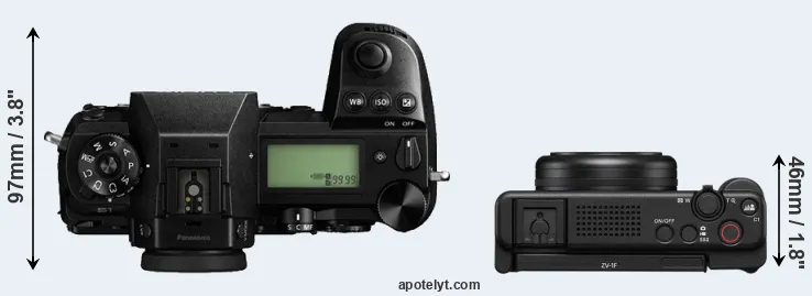 The side-by-side display below illustrates the physical size and weight of the Panasonic S1 and the Sony ZV-1F. The two cameras are presented according to their relative size. Three consecutive views from the front, the top, and the rear side are shown. All width, height and depth dimensions are rounded to the nearest millimeter.