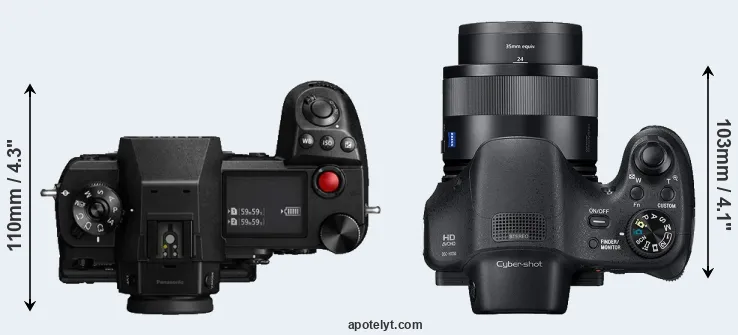 The side-by-side display below illustrates the physical size and weight of the Panasonic S1H and the Sony HX350. The two cameras are presented according to their relative size. Three consecutive views from the front, the top, and the rear side are shown. All size dimensions are rounded to the nearest millimeter.