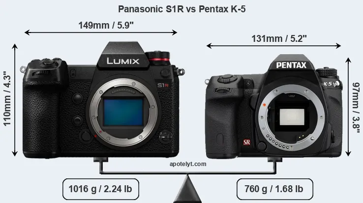 The physical size and weight of the Panasonic S1R and the Pentax K-5 are illustrated in the side-by-side display below. The two cameras are presented according to their relative size. Three successive views from the front, the top, and the rear are shown. All width, height and depth measures are rounded to the nearest millimeter.
