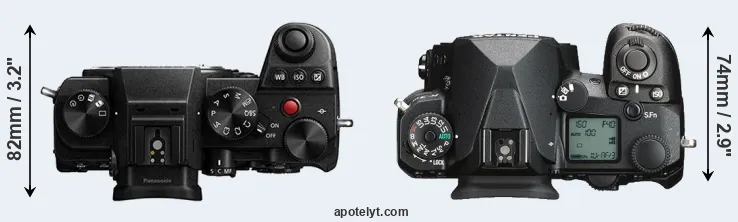 The side-by-side display below illustrates the physical size and weight of the Panasonic S5 and the Pentax K-3 III. The two cameras are presented according to their relative size. Three successive views from the front, the top, and the rear are shown. All width, height and depth measures are rounded to the nearest millimeter.