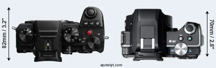 An illustration of the physical size and weight of the Panasonic S5 and the Pentax K-S1 is provided in the side-by-side display below. The two cameras are presented according to their relative size. Three consecutive views from the front, the top, and the rear side are shown. All size dimensions are rounded to the nearest millimeter.