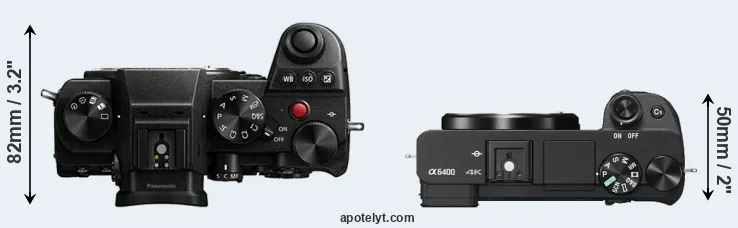 The physical size and weight of the Panasonic S5 and the Sony A6400 are illustrated in the side-by-side display below. The two cameras are presented according to their relative size. Three consecutive views from the front, the top, and the rear side are shown. All size dimensions are rounded to the nearest millimeter.