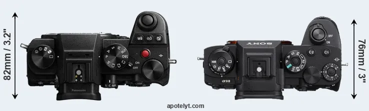 An illustration of the physical size and weight of the Panasonic S5 and the Sony A9 II is provided in the side-by-side display below. The two cameras are presented according to their relative size. Three successive views from the front, the top, and the rear are shown. All size dimensions are rounded to the nearest millimeter.