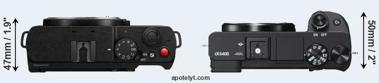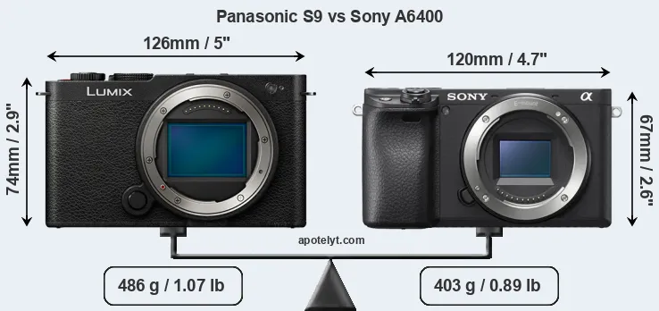 The physical size and weight of the Panasonic S9 and the Sony A6400 are illustrated in the side-by-side display below. The two cameras are presented according to their relative size. Three successive views from the front, the top, and the rear are shown. All size dimensions are rounded to the nearest millimeter.