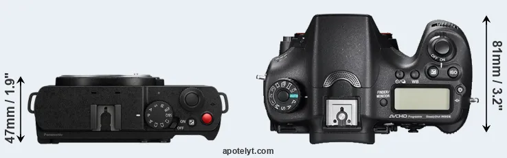 The physical size and weight of the Panasonic S9 and the Sony A77 II are illustrated in the side-by-side display below. The two cameras are presented according to their relative size. Three successive views from the front, the top, and the rear are shown. All width, height and depth measures are rounded to the nearest millimeter.