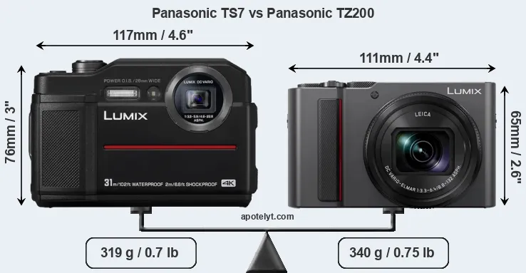 If the front view area (width x height) of the cameras is taken as an aggregate measure of their size, the Panasonic TZ200 is notably smaller (19 percent) than the Panasonic TS7. However, the TZ200 is markedly heavier (7 percent) than the TS7. It is worth mentioning in this context that the TS7 is splash and dust resistant, while the TZ200 does not feature any corresponding weather-sealing. More than that, the TS7 is water-proof up to 31m and can, thus, be used for underwater photography.