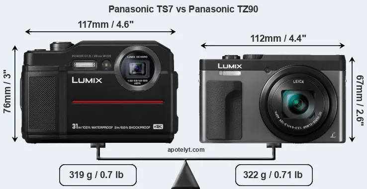 An illustration of the physical size and weight of the Panasonic TS7 and the Panasonic TZ90 is provided in the side-by-side display below. The two cameras are presented according to their relative size. Three consecutive views from the front, the top, and the rear side are shown. All width, height and depth measures are rounded to the nearest millimeter.