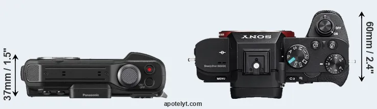 The side-by-side display below illustrates the physical size and weight of the Panasonic TS7 and the Sony A7R II. The two cameras are presented according to their relative size. Three successive views from the front, the top, and the rear are shown. All width, height and depth dimensions are rounded to the nearest millimeter.