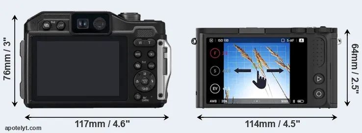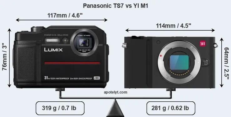 The physical size and weight of the Panasonic TS7 and the YI M1 are illustrated in the side-by-side display below. The two cameras are presented according to their relative size. Three successive views from the front, the top, and the rear are shown. All width, height and depth measures are rounded to the nearest millimeter.