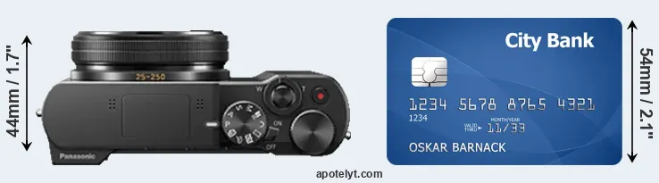The physical dimensions of the Panasonic TZ100 relative to a credit card are illustrated in the side-by-side display below. Three successive views from the front, the top, and the rear are shown. All size dimensions are rounded to the nearest millimeter.