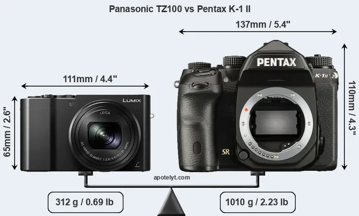 An illustration of the physical size and weight of the Panasonic TZ100 and the Pentax K-1 II is provided in the side-by-side display below. The two cameras are presented according to their relative size. Three successive views from the front, the top, and the rear are shown. All width, height and depth dimensions are rounded to the nearest millimeter.