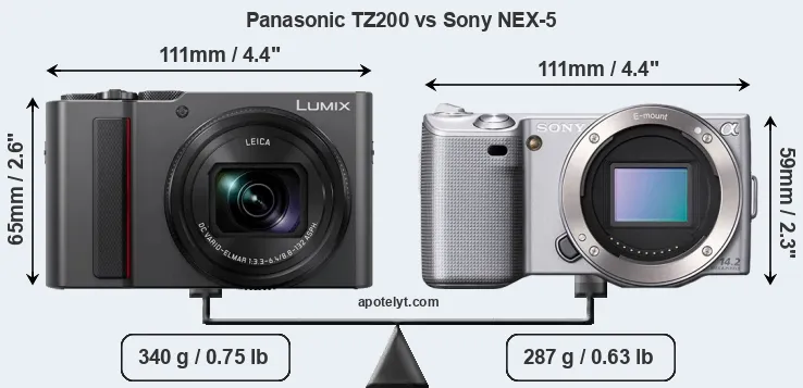 The side-by-side display below illustrates the physical size and weight of the Panasonic TZ200 and the Sony NEX-5. The two cameras are presented according to their relative size. Three consecutive perspectives from the front, the top, and the back are available. All width, height and depth dimensions are rounded to the nearest millimeter.