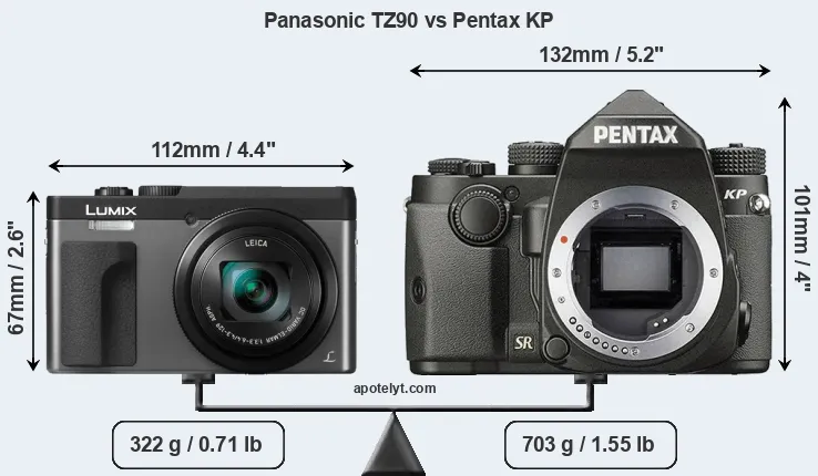 The side-by-side display below illustrates the physical size and weight of the Panasonic TZ90 and the Pentax KP. The two cameras are presented according to their relative size. Three consecutive perspectives from the front, the top, and the back are available. All width, height and depth measures are rounded to the nearest millimeter.