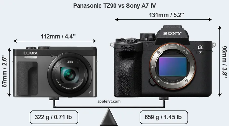The above size and weight comparisons are to some extent incomplete and possibly misleading, as the TZ90 has a lens built in, whereas the A7 IV is an interchangeable lens camera that requires a separate lens. Attaching the latter will add extra weight and bulk to the setup. You can compare the optics available for the A7 IV and their specifications in the Sony FE Lens Catalog.