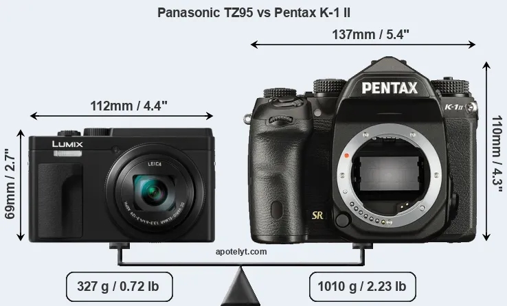 The side-by-side display below illustrates the physical size and weight of the Panasonic TZ95 and the Pentax K-1 II. The two cameras are presented according to their relative size. Three consecutive perspectives from the front, the top, and the back are available. All width, height and depth measures are rounded to the nearest millimeter.