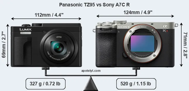 An illustration of the physical size and weight of the Panasonic TZ95 and the Sony A7C R is provided in the side-by-side display below. The two cameras are presented according to their relative size. Three successive views from the front, the top, and the rear are shown. All width, height and depth dimensions are rounded to the nearest millimeter.