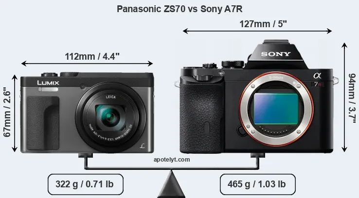 The above size and weight comparisons are to some extent incomplete and possibly misleading, as the ZS70 has a lens built in, whereas the A7R is an interchangeable lens camera that requires a separate lens. Attaching the latter will add extra weight and bulk to the setup. You can compare the optics available for the A7R and their specifications in the Sony FE Lens Catalog.