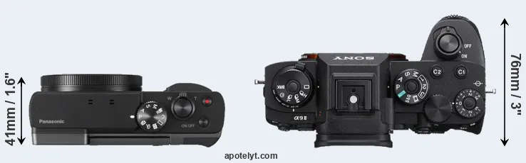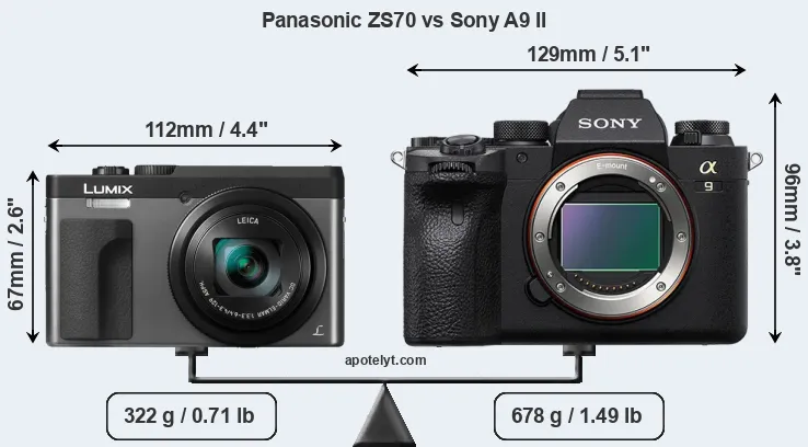 The side-by-side display below illustrates the physical size and weight of the Panasonic ZS70 and the Sony A9 II. The two cameras are presented according to their relative size. Three consecutive perspectives from the front, the top, and the back are available. All width, height and depth dimensions are rounded to the nearest millimeter.