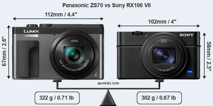 The side-by-side display below illustrates the physical size and weight of the Panasonic ZS70 and the Sony RX100 VII. The two cameras are presented according to their relative size. Three consecutive perspectives from the front, the top, and the back are available. All size dimensions are rounded to the nearest millimeter.