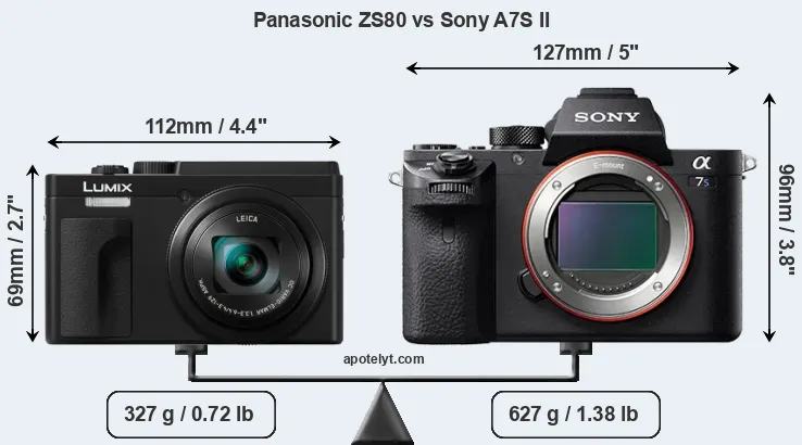 The physical size and weight of the Panasonic ZS80 and the Sony A7S II are illustrated in the side-by-side display below. The two cameras are presented according to their relative size. Three successive views from the front, the top, and the rear are shown. All width, height and depth measures are rounded to the nearest millimeter.