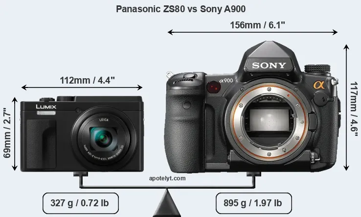 If the front view area (width x height) of the cameras is taken as an aggregate measure of their size, the Sony A900 is considerably larger (136 percent) than the Panasonic ZS80. It is noteworthy in this context that the A900 is splash and dust-proof, while the ZS80 does not feature any corresponding weather-sealing.