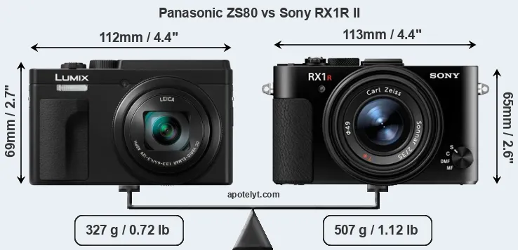 If the front view area (width x height) of the cameras is taken as an aggregate measure of their size, the Sony RX1R II is notably smaller (5 percent) than the Panasonic ZS80. However, the RX1R II is substantially heavier (55 percent) than the ZS80. In this context, it is worth noting that neither the ZS80 nor the RX1R II are weather-sealed.