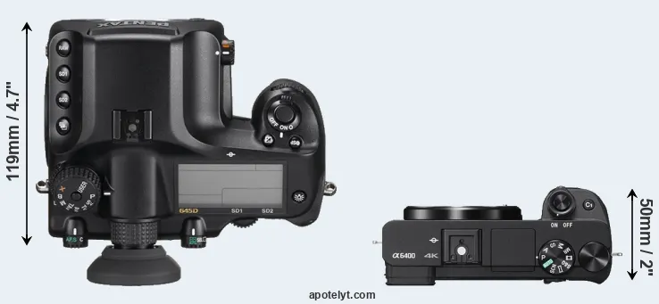 The side-by-side display below illustrates the physical size and weight of the Pentax 645D and the Sony A6400. The two cameras are presented according to their relative size. Three consecutive views from the front, the top, and the rear side are shown. All size dimensions are rounded to the nearest millimeter.