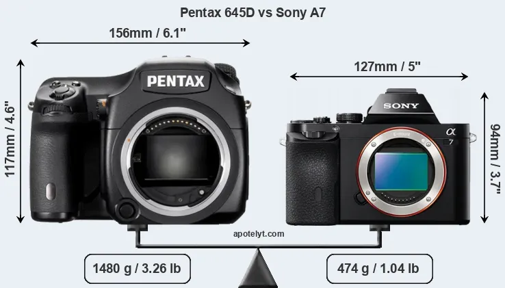 If the front view area (width x height) of the cameras is taken as an aggregate measure of their size, the Sony A7 is considerably smaller (35 percent) than the Pentax 645D. Moreover, the A7 is substantially lighter (68 percent) than the 645D. In this context, it is worth noting that both cameras are splash and dust-proof and can, hence, be used in inclement weather conditions or harsh environments.