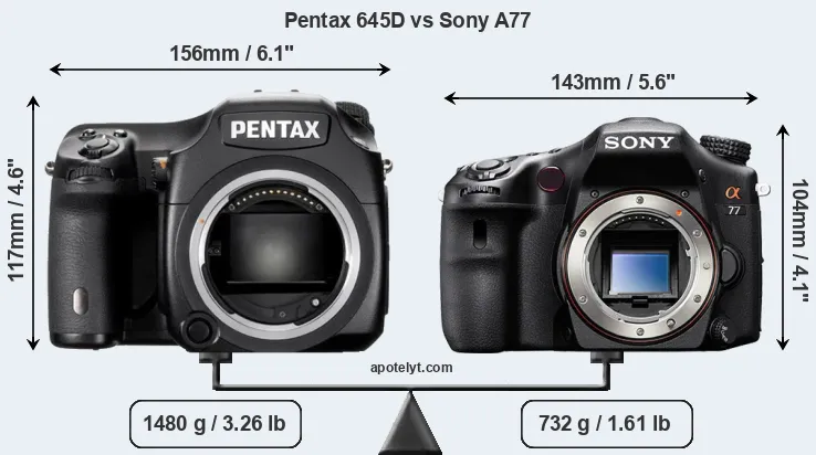 The physical size and weight of the Pentax 645D and the Sony A77 are illustrated in the side-by-side display below. The two cameras are presented according to their relative size. Three successive views from the front, the top, and the rear are shown. All width, height and depth measures are rounded to the nearest millimeter.