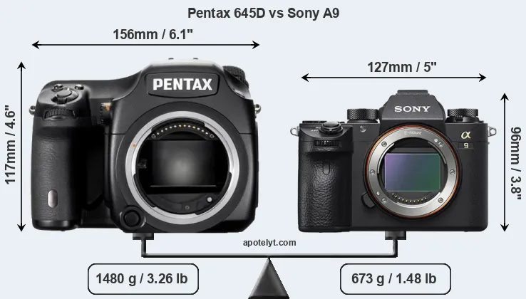 The side-by-side display below illustrates the physical size and weight of the Pentax 645D and the Sony A9. The two cameras are presented according to their relative size. Three successive views from the front, the top, and the rear are shown. All size dimensions are rounded to the nearest millimeter.