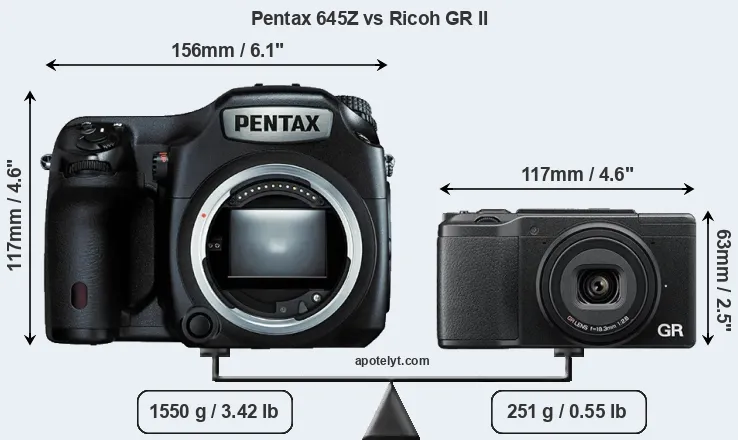 If the front view area (width x height) of the cameras is taken as an aggregate measure of their size, the Ricoh GR II is considerably smaller (60 percent) than the Pentax 645Z. It is worth mentioning in this context that the 645Z is splash and dust resistant, while the GR II does not feature any corresponding weather-sealing.