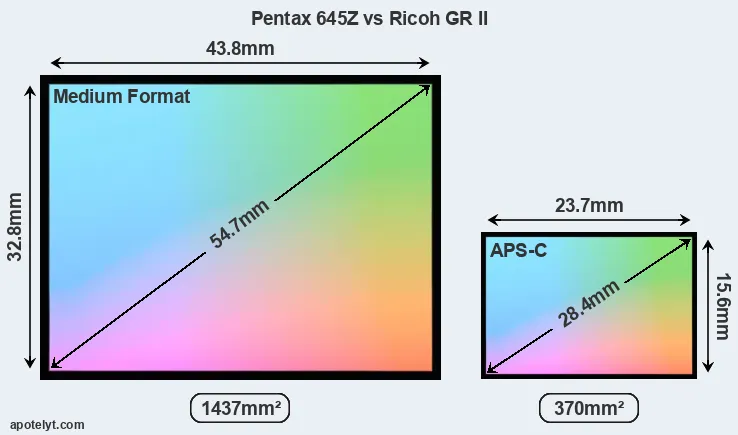 Of the two cameras under consideration, the Pentax 645Z features a medium format sensor and the Ricoh GR II an APS-C sensor. The sensor area in the GR II is 74 percent smaller. As a result of these sensor size differences, the cameras have a format factor of, respectively, 0.79 and 1.5. The sensor in the 645Z has a native 4:3 aspect ratio, while the one in the GR II offers a 3:2 aspect.