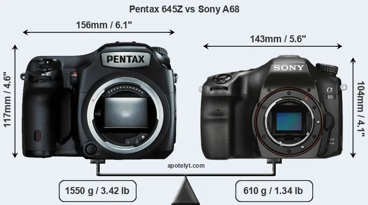 If the front view area (width x height) of the cameras is taken as an aggregate measure of their size, the Sony A68 is notably smaller (19 percent) than the Pentax 645Z. Moreover, the A68 is substantially lighter (61 percent) than the 645Z. It is worth mentioning in this context that the 645Z is splash and dust resistant, while the A68 does not feature any corresponding weather-sealing.