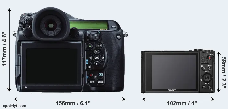 If the front view area (width x height) of the cameras is taken as an aggregate measure of their size, the Sony HX95 is considerably smaller (68 percent) than the Pentax 645Z. It is worth mentioning in this context that the 645Z is splash and dust resistant, while the HX95 does not feature any corresponding weather-sealing.