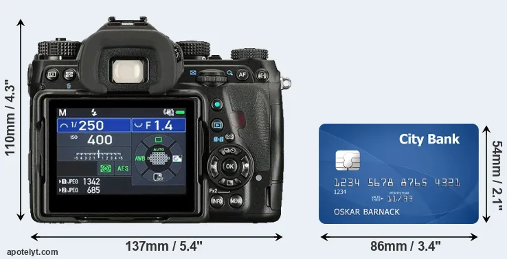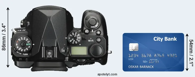 The side-by-side display below illustrates the physical size of the Pentax K-1 II vis-à-vis a credit card. Three consecutive views from the front, the top, and the rear side are shown. All width, height and depth measures are rounded to the nearest millimeter.