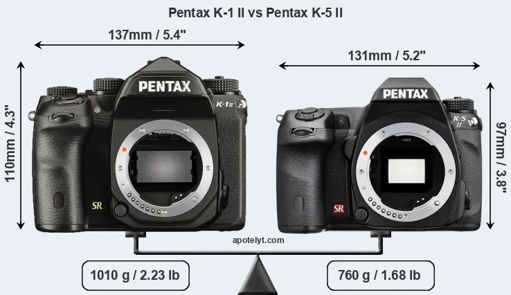 An illustration of the physical size and weight of the Pentax K-1 II and the Pentax K-5 II is provided in the side-by-side display below. The two cameras are presented according to their relative size. Three consecutive views from the front, the top, and the rear side are shown. All width, height and depth measures are rounded to the nearest millimeter.