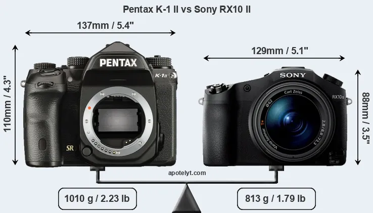 An illustration of the physical size and weight of the Pentax K-1 II and the Sony RX10 II is provided in the side-by-side display below. The two cameras are presented according to their relative size. Three consecutive views from the front, the top, and the rear side are shown. All width, height and depth measures are rounded to the nearest millimeter.
