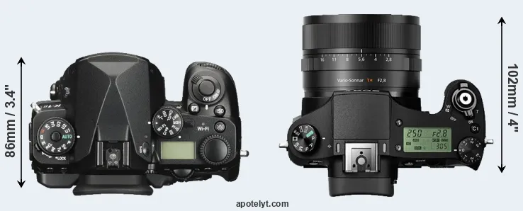 The above size and weight comparisons are to some extent incomplete and possibly misleading, as the RX10 II has a lens built in, whereas the K-1 II is an interchangeable lens camera that requires a separate lens. Attaching the latter will add extra weight and bulk to the setup.
