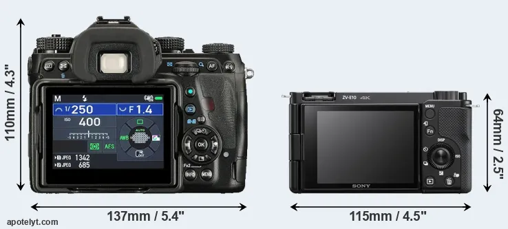 Going beyond this snapshot of core features and characteristics, what are the differences between the Pentax K-1 II and the Sony ZV-E10? Which one should you buy? Read on to find out how these two cameras compare with respect to their body size, their imaging sensors, their shooting features, their input-output connections, and their reception by expert reviewers.