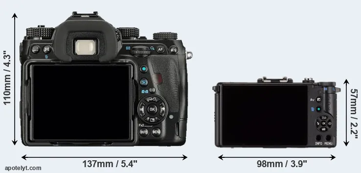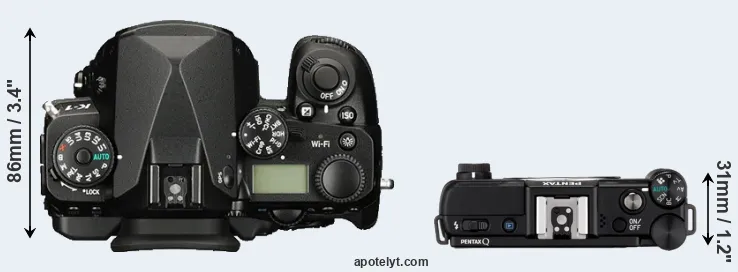 The physical size and weight of the Pentax K-1 and the Pentax Q are illustrated in the side-by-side display below. The two cameras are presented according to their relative size. Three successive views from the front, the top, and the rear are shown. All width, height and depth measures are rounded to the nearest millimeter.