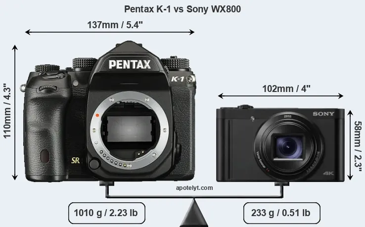 The above size and weight comparisons are to some extent incomplete and possibly misleading, as the WX800 has a lens built in, whereas the K-1 is an interchangeable lens camera that requires a separate lens. Attaching the latter will add extra weight and bulk to the setup.