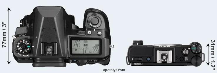 The physical size and weight of the Pentax K-3 II and the Pentax Q are illustrated in the side-by-side display below. The two cameras are presented according to their relative size. Three consecutive views from the front, the top, and the rear side are shown. All size dimensions are rounded to the nearest millimeter.