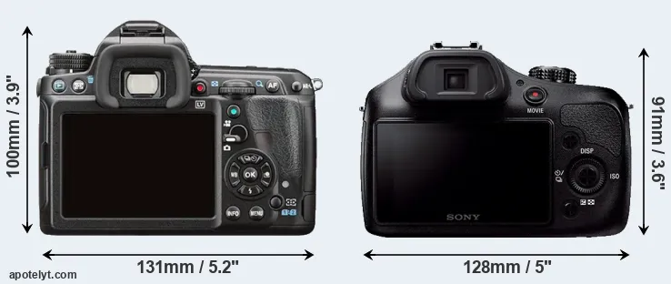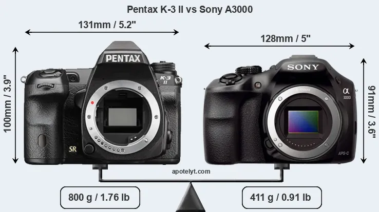 An illustration of the physical size and weight of the Pentax K-3 II and the Sony A3000 is provided in the side-by-side display below. The two cameras are presented according to their relative size. Three consecutive perspectives from the front, the top, and the back are available. All size dimensions are rounded to the nearest millimeter.