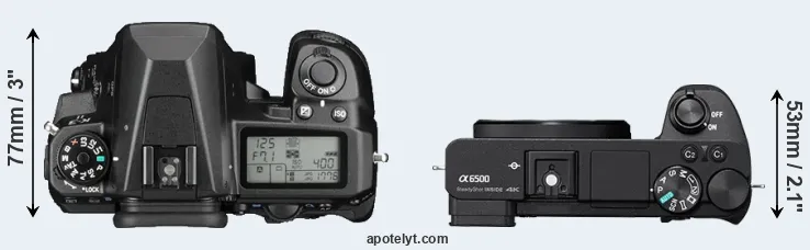 The side-by-side display below illustrates the physical size and weight of the Pentax K-3 II and the Sony A6500. The two cameras are presented according to their relative size. Three consecutive views from the front, the top, and the rear side are shown. All width, height and depth dimensions are rounded to the nearest millimeter.