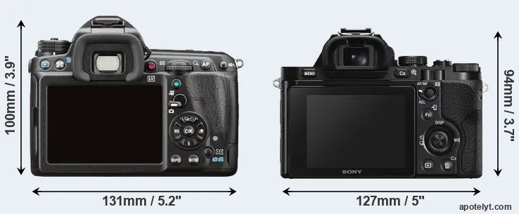 The physical size and weight of the Pentax K-3 II and the Sony A7S are illustrated in the side-by-side display below. The two cameras are presented according to their relative size. Three consecutive perspectives from the front, the top, and the back are available. All width, height and depth measures are rounded to the nearest millimeter.