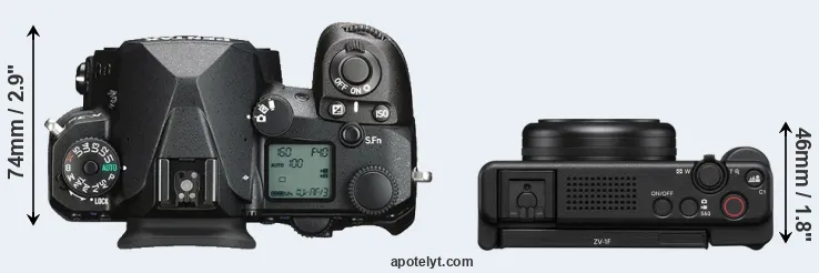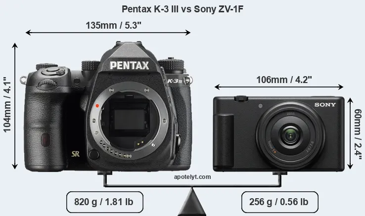 An illustration of the physical size and weight of the Pentax K-3 III and the Sony ZV-1F is provided in the side-by-side display below. The two cameras are presented according to their relative size. Three successive views from the front, the top, and the rear are shown. All width, height and depth dimensions are rounded to the nearest millimeter.