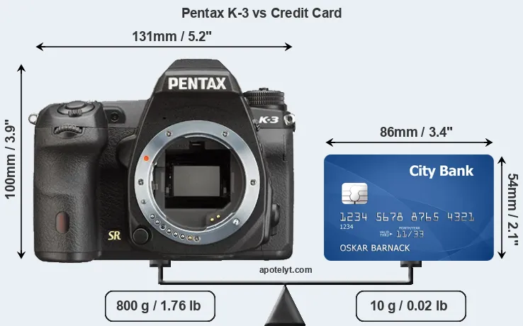 An illustration of the physical dimensions of the Pentax K-3 vis-à-vis a credit card is provided in the side-by-side display below. Three consecutive views from the front, the top, and the rear side are shown. All width, height and depth measures are rounded to the nearest millimeter.