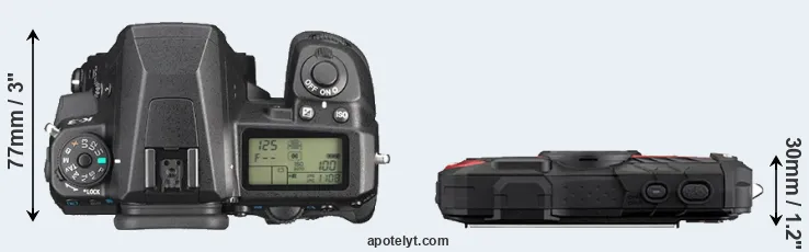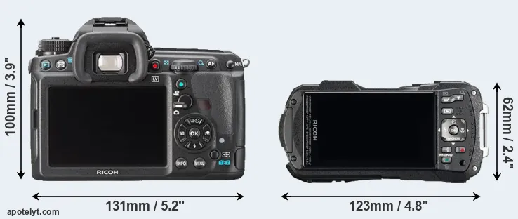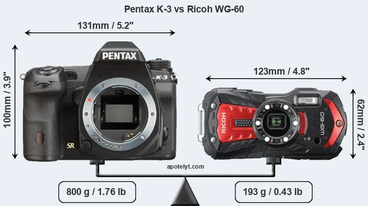 The side-by-side display below illustrates the physical size and weight of the Pentax K-3 and the Ricoh WG-60. The two cameras are presented according to their relative size. Three consecutive perspectives from the front, the top, and the back are available. All width, height and depth measures are rounded to the nearest millimeter.