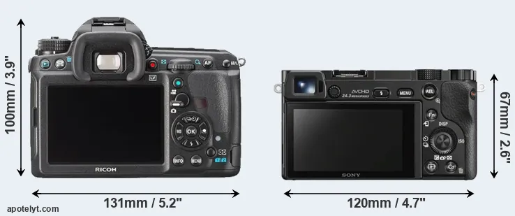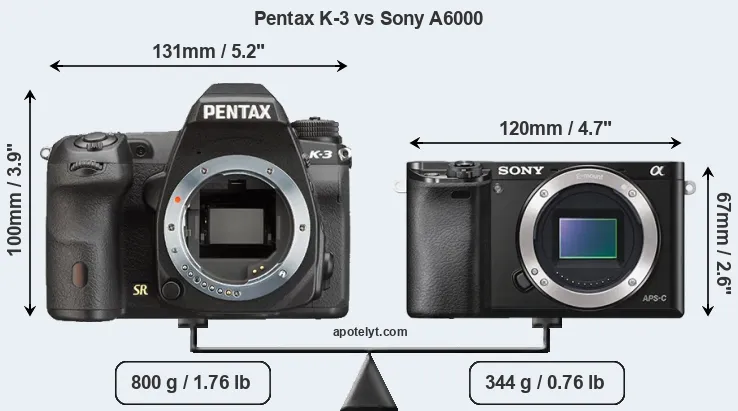 The side-by-side display below illustrates the physical size and weight of the Pentax K-3 and the Sony A6000. The two cameras are presented according to their relative size. Three consecutive perspectives from the front, the top, and the back are available. All width, height and depth measures are rounded to the nearest millimeter.